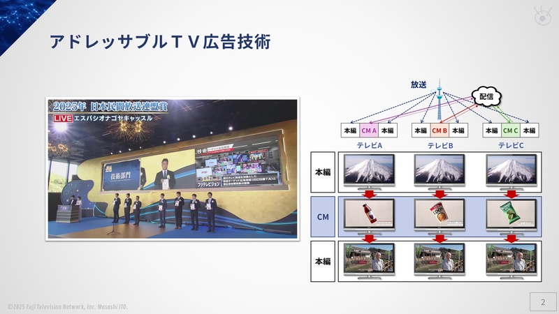 フジテレビ・伊藤氏は、自身が開発を主導してきた「アドレッサブルTV」技術を紹介した。