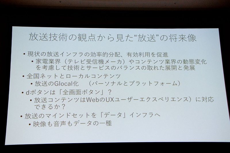 「テレビ製造が中国メーカー中心となる中で、(世界的に普及率の高い地デジ規格DVB-Tを優先し、日本などの地デジ規格である)ISDB-Tに対応するチューナーを製造しなくなる可能性がある」と、東京大学・川森氏はハードウェア供給のリスクを指摘。その上で「放送とはデータを送ること」という概念の転換を提唱し、「伝送路が放送波であるか光ファイバーであるかに固執すべきではない」と語った。