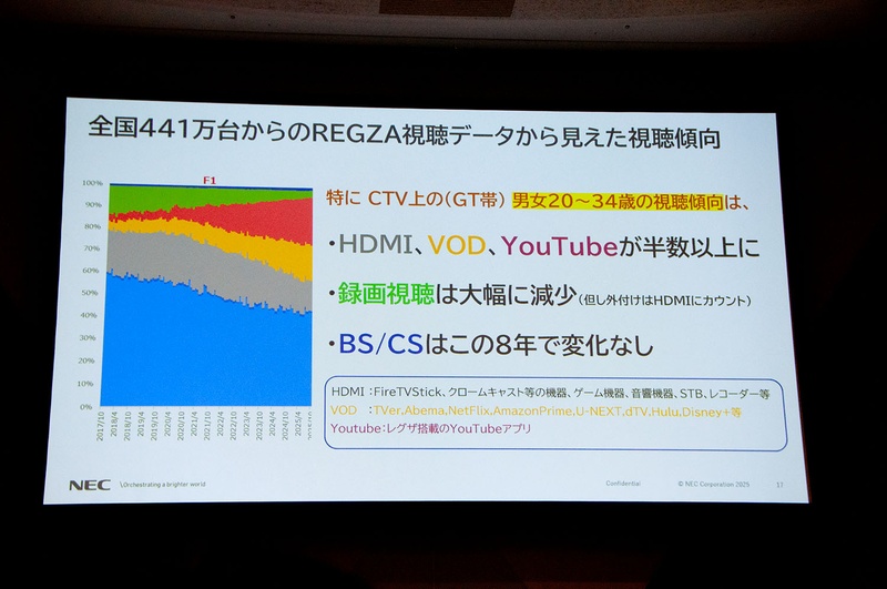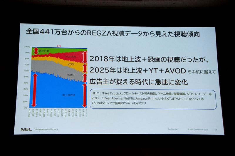 過去にビデオリサーチやインテージでメディア領域に携わった経歴を持つモデレーターの深田氏は、東芝のテレビ「REGZA」全国約440万台の視聴データを基に、テレビデバイスの使われ方の変化を提示した。