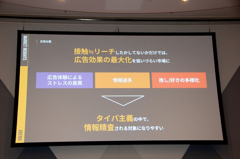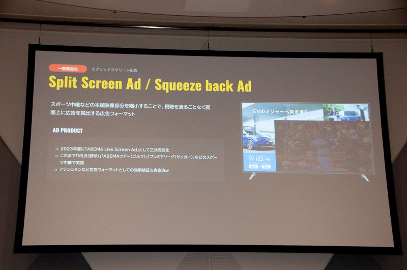 またABEMAでは、スポーツ中継などCMを入れづらいライブコンテンツに対して、視聴を阻害しない「スプリットスクリーン」広告を導入。これもユーザーの不快度が低く、高い広告効果を上げていると説明した。
