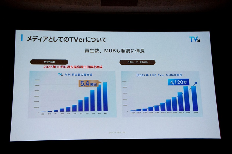 TVerの廣田一章氏は、2025年10月にサービス開始10周年を迎えたことを報告。MAU(月間アクティブユーザー数)が4120万人、月間総再生数が5.4億回を突破するなど事業が好調という。