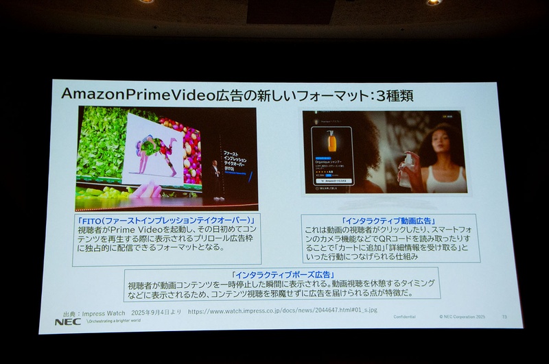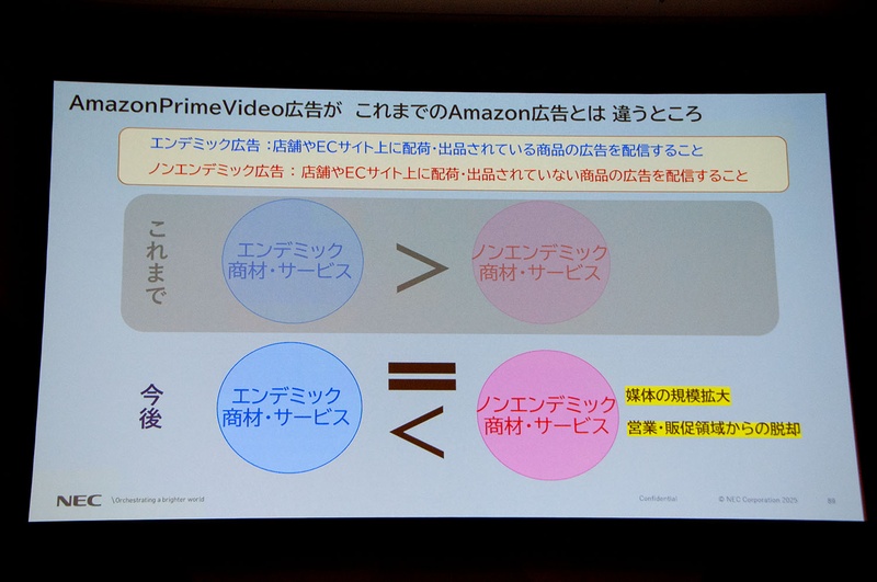 深田氏は、Amazon Prime Videoの広告展開において、Amazonのサイト上で直接販売していない自動車や不動産、保険といった「ノンエンデミック広告」の獲得に注力し、専門の営業部隊を立ち上げているという事例を紹介。