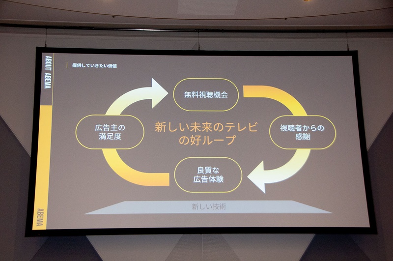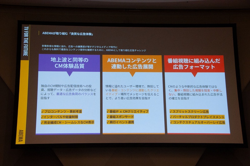続いてAbemaTV・大久保氏は、「新しい未来のテレビを作ろう」というテーマのもと、「良質な広告体験」を追求する姿勢を強調した。