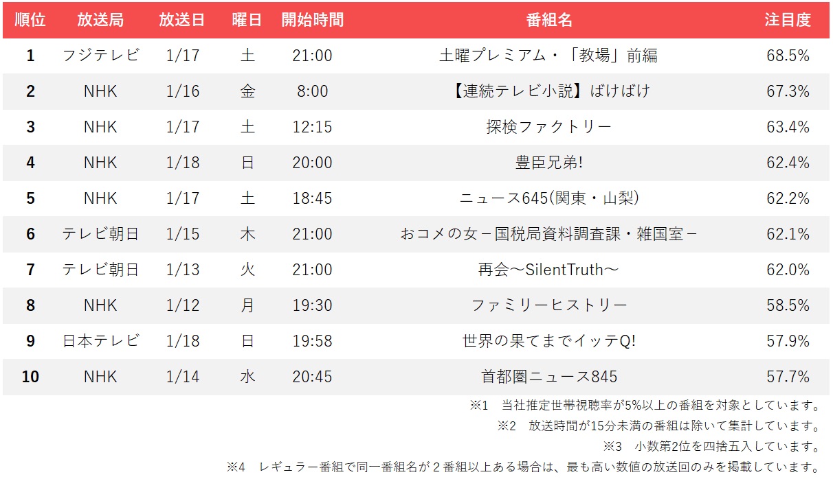 コア視聴層(男女13〜49歳)のランキングでは、フジテレビ「土曜プレミアム・教場 前編」が注目度68.5%で1位を獲得している。