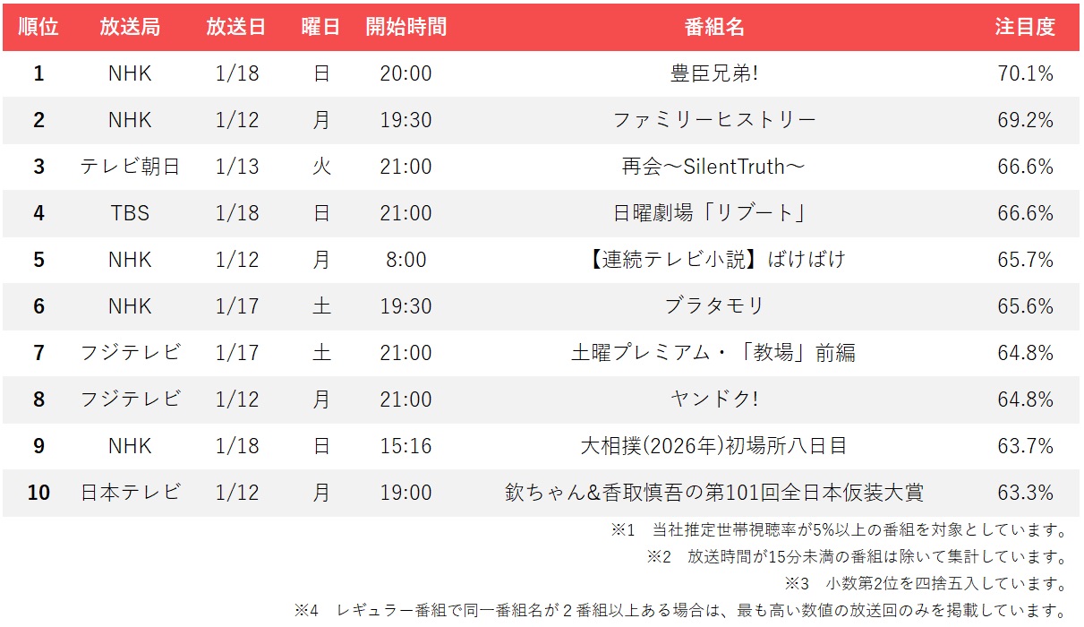 一方、バラエティでは日本テレビ「欽ちゃん&香取慎吾の第101回全日本仮装大賞」が個人全体10位にランクインし、長寿番組ならではの安定した人気を示した。また「大相撲初場所」も中盤戦の熱気がお茶の間に届き、堅実な注目を集めた。連休明けの平日に家族で楽しめるコンテンツが選ばれた印象だ。
