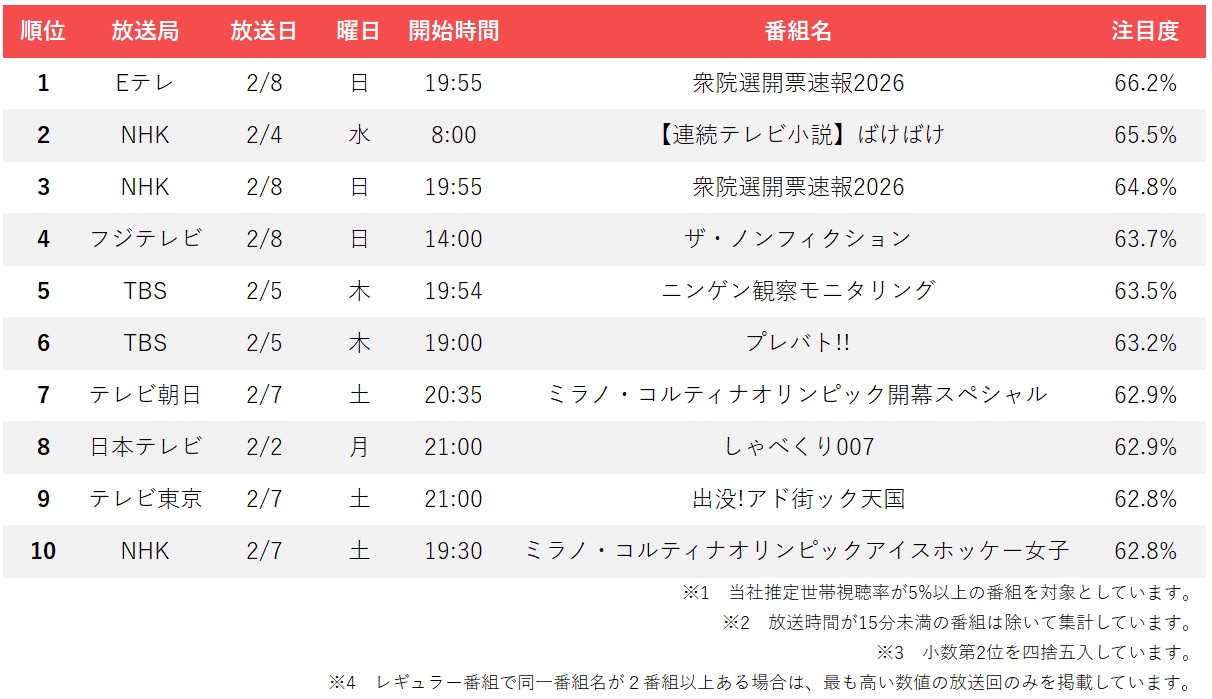 2月2日から8日の週は、衆議院選挙の開票速報とミラノ・コルティナオリンピック関連番組がランキング上位を占め、大型イベントに注目が集まった。