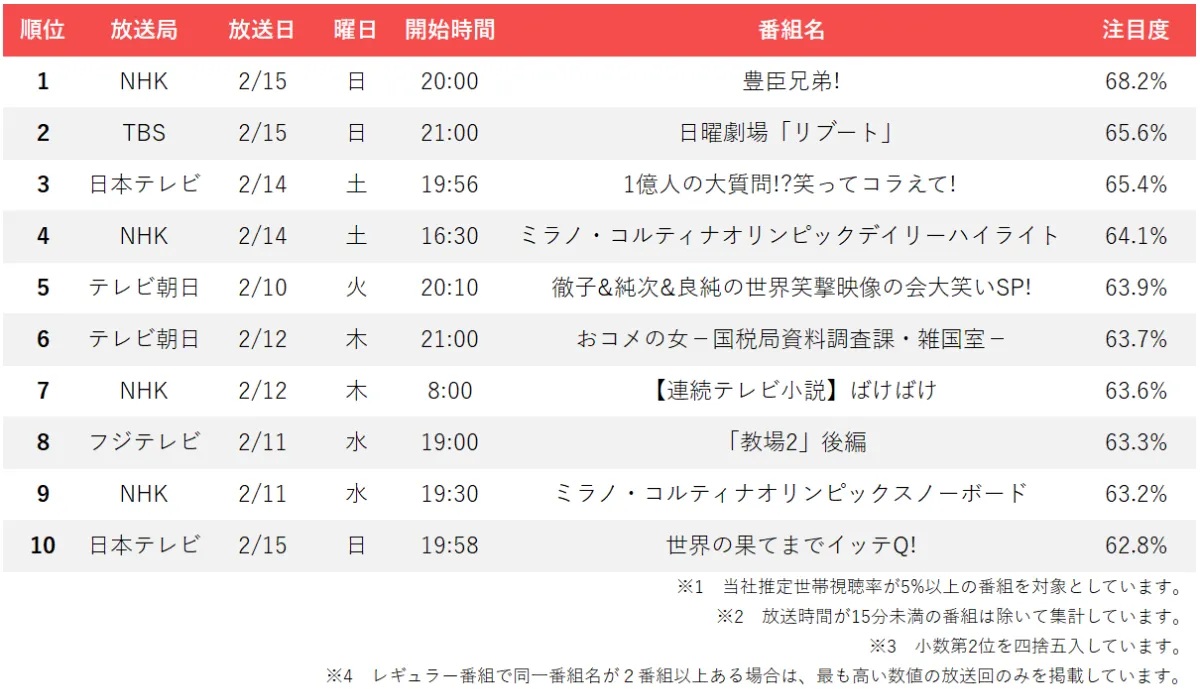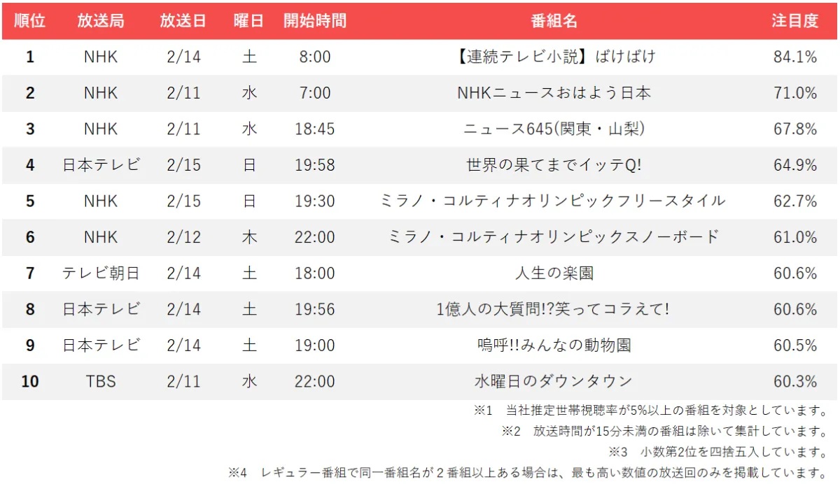 民放ではテレビ朝日の特番や連ドラが安定した存在感を見せ、フジテレビの「教場2」後編も8位にランクイン。来週以降も五輪中継と連続ドラマの注目度争いから目が離せない。