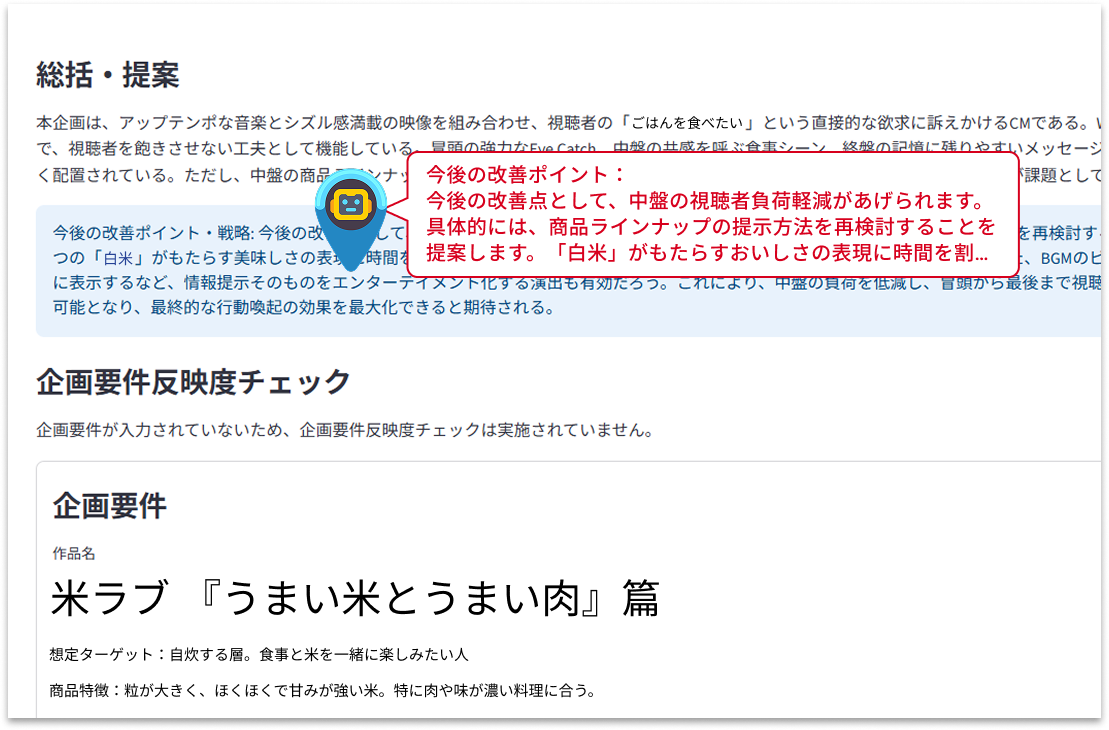 オリエンテーションシートを事前にAIにインプットすることで、全工程において「オリエンテーションの要件を満たしているか」を継続的に評価します。企画の方向性がブレることなく、オリエンの意図に沿ったコンテの評価・改善が可能になります。