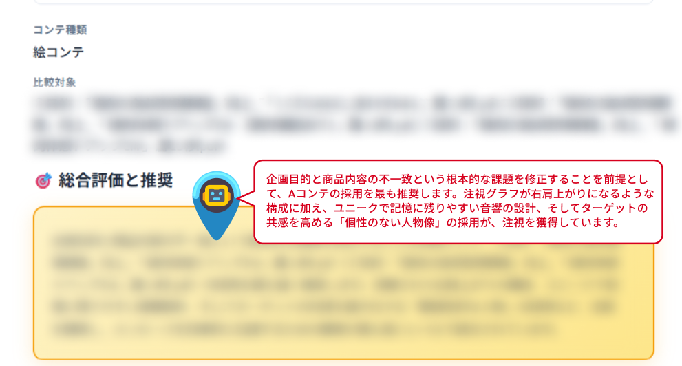 複数の企画コンテをまとめてAIに入力することで、総合評価と順位付けを一括で実施。視聴者の視線を惹きつける要素・セリフとナレーションなど複数の観点から各コンテを比較分析し、「最も注視される案」の選定を客観的なデータで支援します。