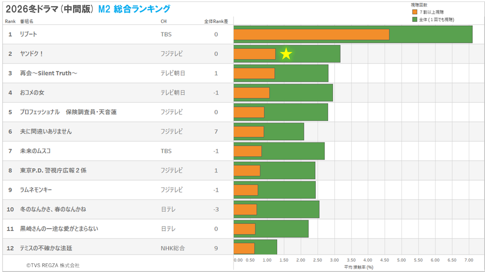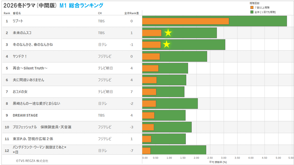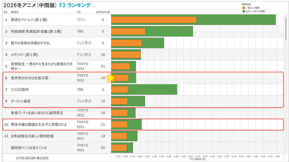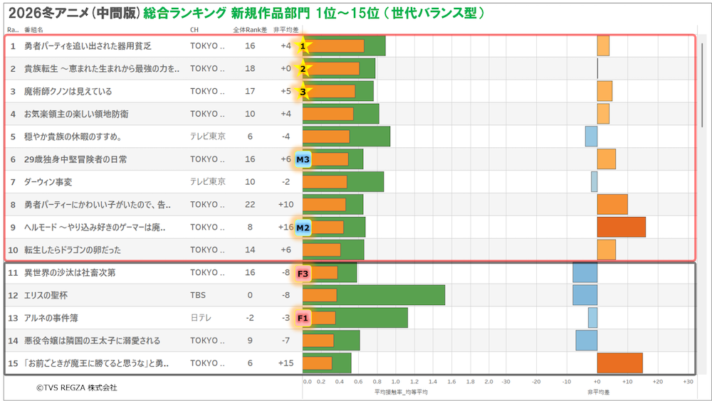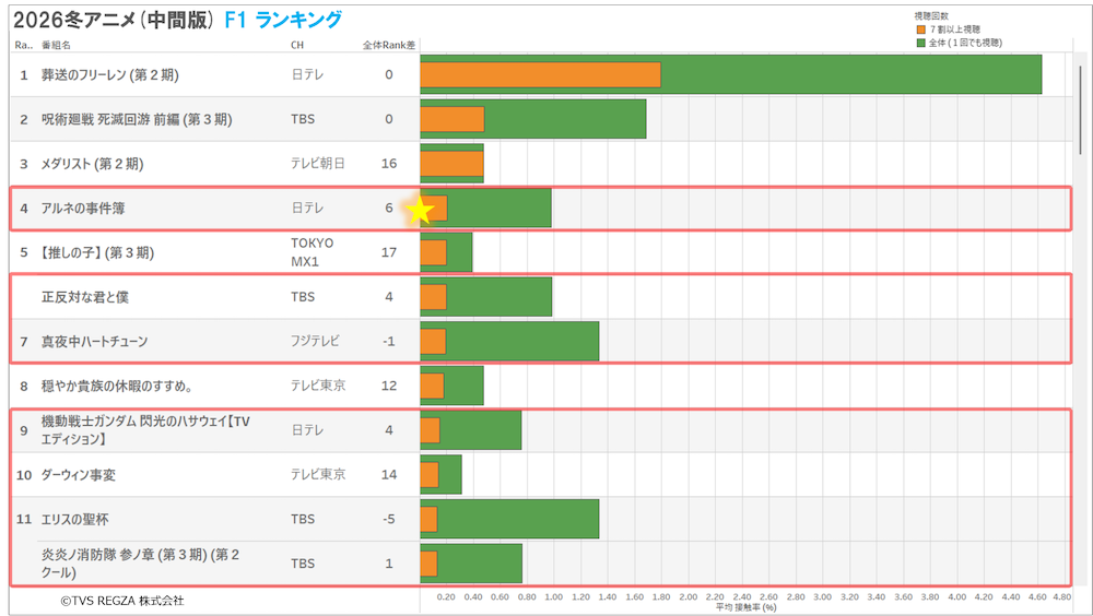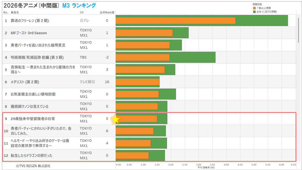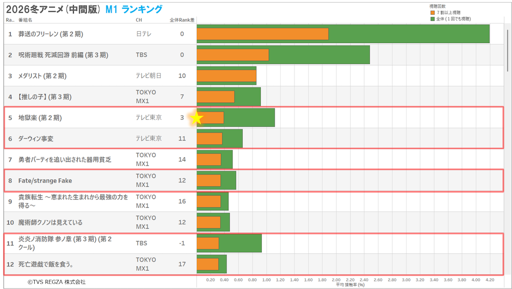 TVS REGZA 株式会社(本社:神奈川県川崎市)は、東京都・神奈川県・埼玉県の63万台のレグザ視聴データ※を基にした、2026年冬アニメ・ドラマの視聴ランキング(中間版)を発表した。