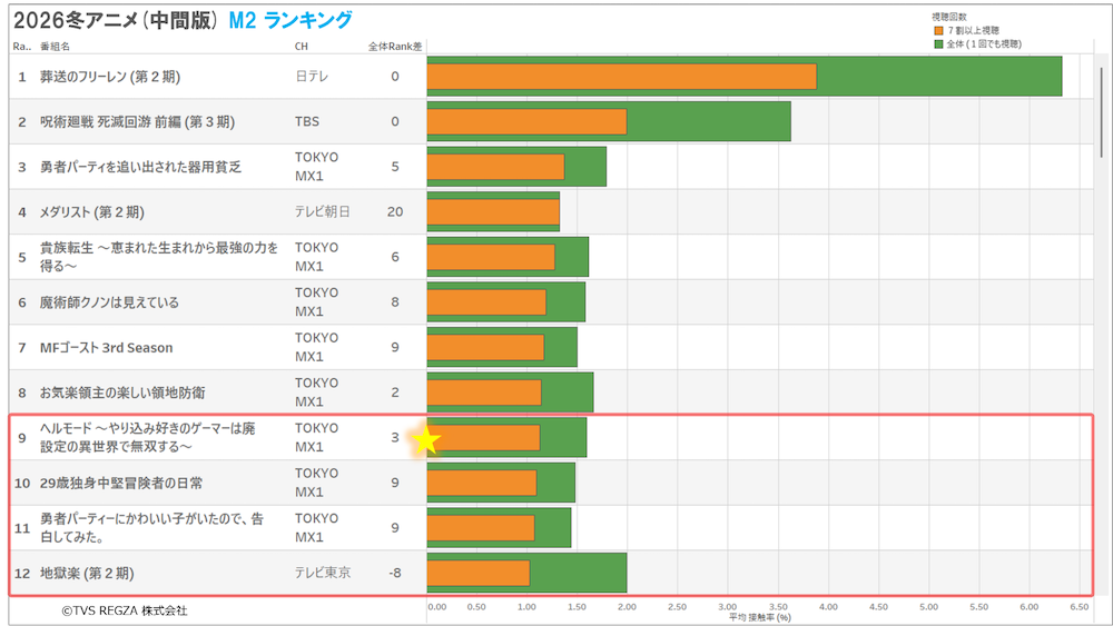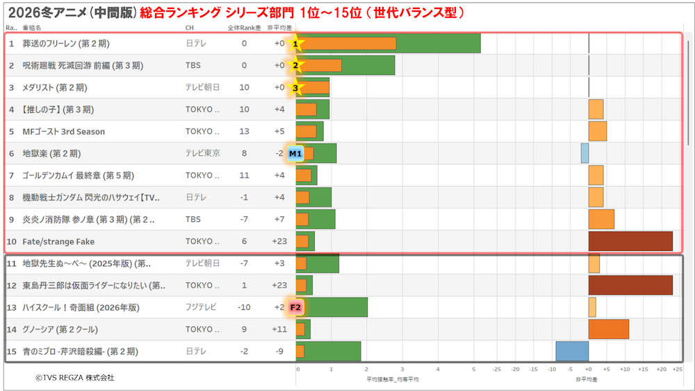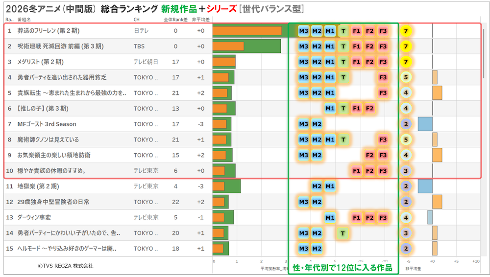 M1も『葬送のフリーレン(第2期)』など人気作が上位を占める中、本層特有の作品として『地獄楽(第2期)』が挙げられる 。異世界モノも複数ランクインしている。