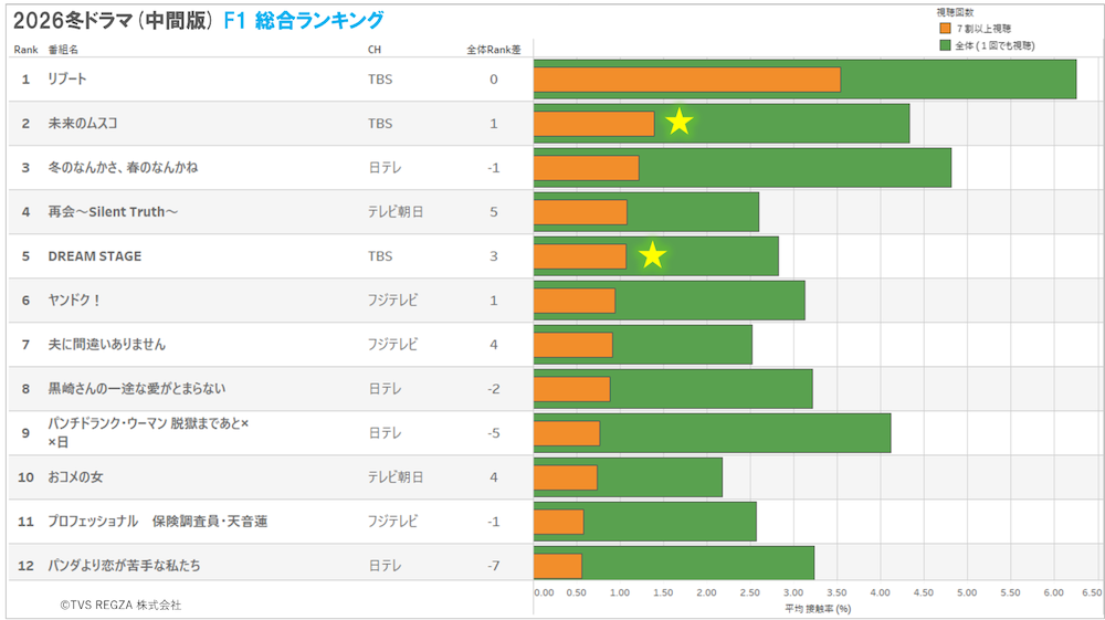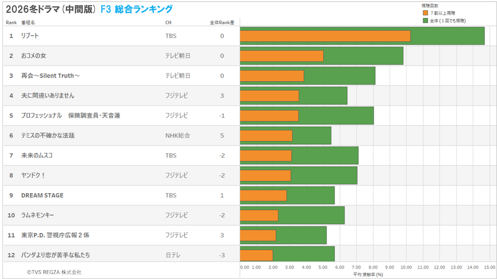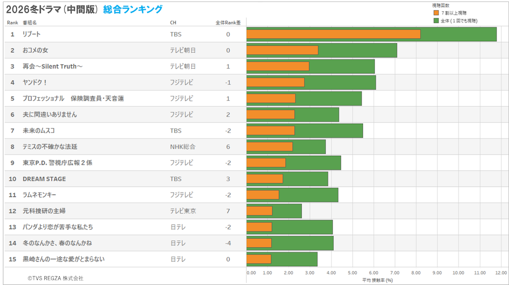 日曜劇場枠の『リブート』が、7割以上視聴のランキングで大きく下位を突き放して堂々の1位となった。2位は松嶋菜々子が久々に主演を務める『おコメの女』、3位は前クールでの演技が光った竹内涼真主演の『再会~Silent Truth~』。1位の『リブート』以外は上位が混戦状態というほど、ほぼ横並びなのが今期の特徴だ。