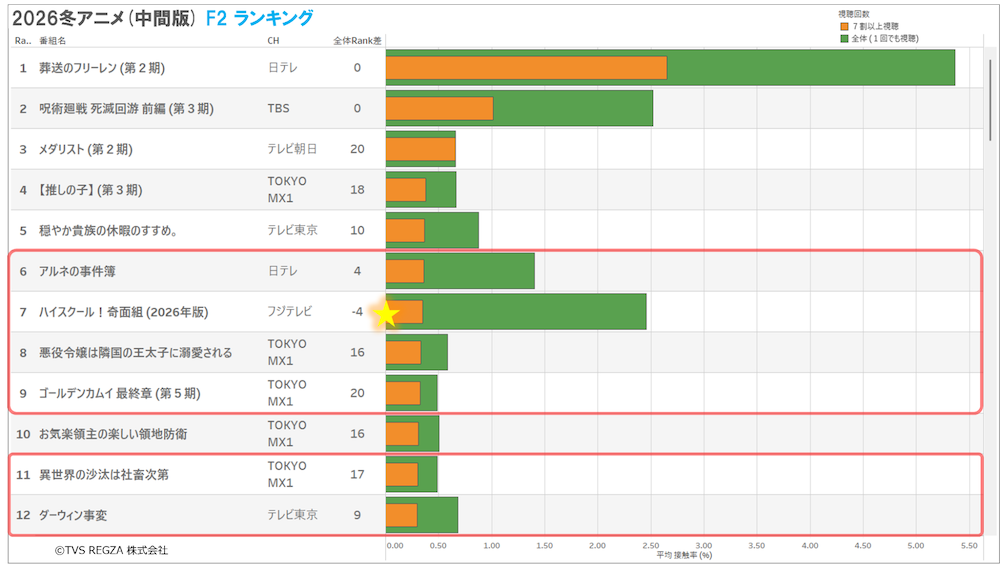 F2の特徴的な作品の筆頭は『ハイスクール!奇面組(2026年版)』。順位は7位ですが、緑のグラフ (1回でも視聴) が2位の『呪術廻戦』と同じぐらい伸びている。
