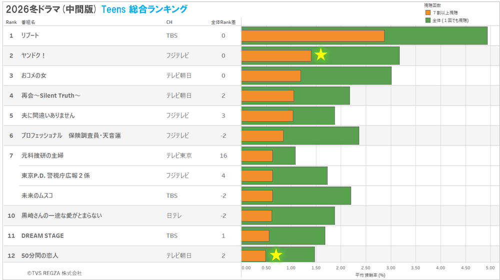 Teensのトップは総合と変わらず『リブート』。一方、橋本環奈演じる元ヤンが凄腕ドクターになって、患者に寄り添いながら病院を変えていこうと奮闘する『ヤンドク!』が2位にランクインしているのが特徴的だ。そして、全世代の中で、唯一恋愛ドラマの『50分間の恋人』がランクインしている。