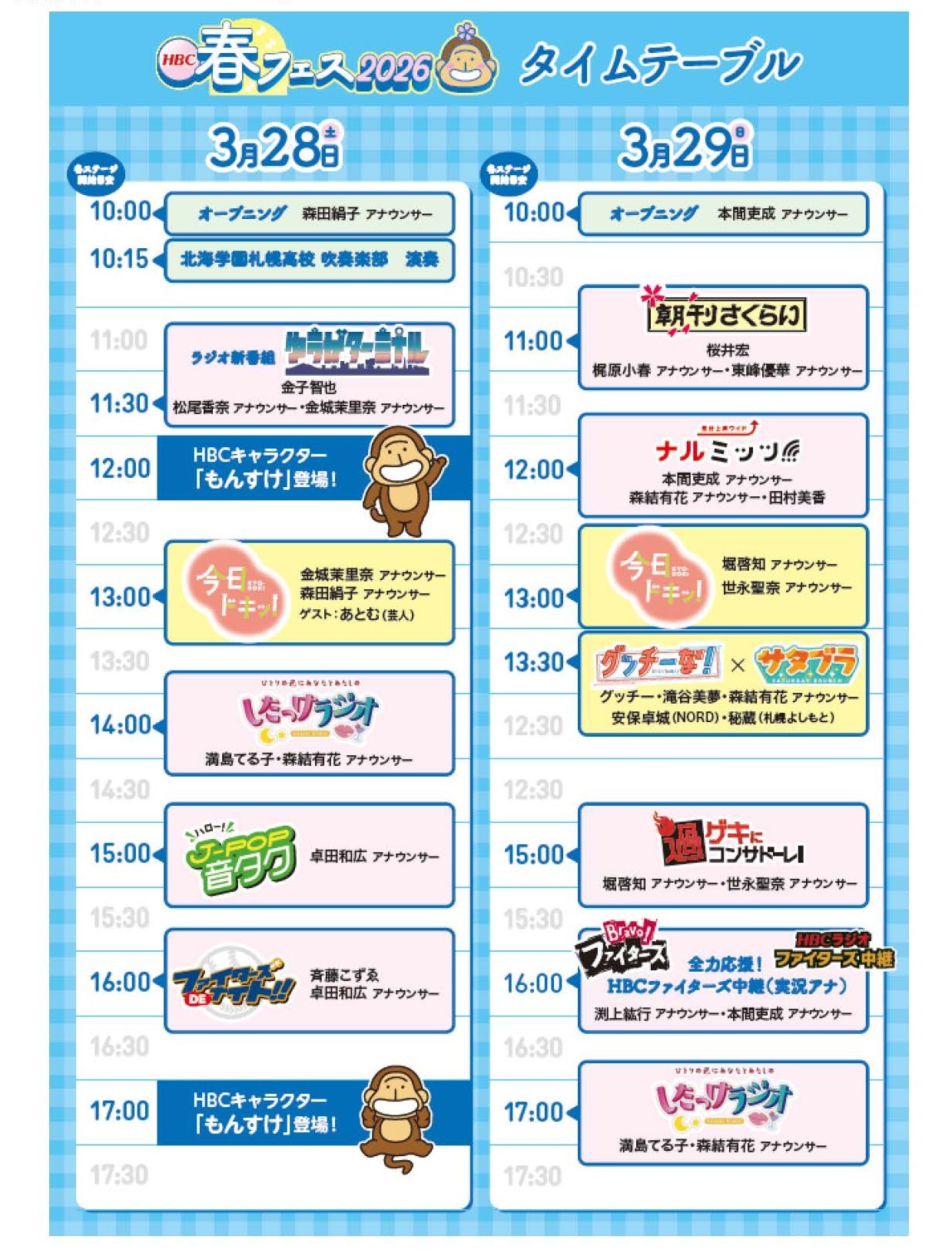 北海道放送株式会社(HBC)は、2026年3月28日(土)・29日(日)の2日間、新さっぽろサンピアザにて開催する「HBC春フェス2026」の全ステージプログラムおよび出演者を決定した。