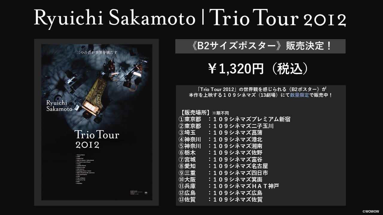映画『Ryuichi Sakamoto | Trio Tour 2012』は、3月27日(金)より109シネマズプレミアム新宿、Bunkamuraル・シネマ 渋谷宮下を始め順次公開される。 さらに、中学生以下を対象とした特別料金「Kizuna Price|キズナプライス」(900円)も実施する。 本作の世界観を体現したB2ポスターも109シネマズ(13館)限定で販売中だ。 詳細は公式HPを参照。