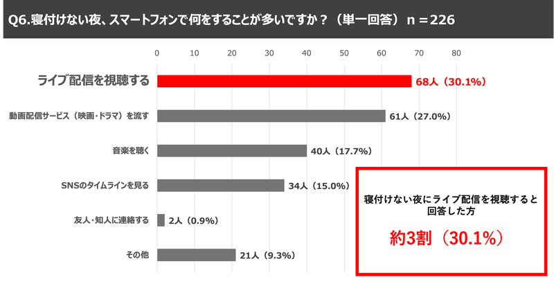 職業で会社員と回答した226名を対象に、新生活シーズンの夜に関する質問をしたところ、4割以上(44.2%)の方が新生活シーズンに「寝付けない夜」があると回答し、さらに寝付けない夜のスマホ行動に関する質問では、約3割(30.1%)の方が「ライブ配信の視聴」と回答し、映画やドラマなどの動画配信サービス視聴(27.0%)を上回るという結果となりました。孤独感を感じやすいと言われる新生活シーズンのひとり時間においては、一人だけで楽しむ動画配信サービスよりも、双方向のコミュニケーションを楽しむことができるライブ配信が求められているのではないかと考えられます。