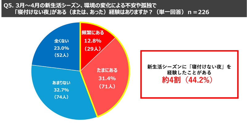 ストレスの多い現代の新生活シーズンにおいて、実に4割(44.2%)を超える方が環境の変化による不安や孤独で「寝付けない夜」があると回答。また寝付けない夜のスマートフォンでの行動として、映画やドラマなどの視聴が可能な動画配信サービスの視聴(27.0%)を抑え「ライブ配信を視聴する」が1位(30.1%)という結果になり、新生活における夜の孤独感等の解消手段として、ライブ配信の視聴が浸透しつつあるということが分かりました。