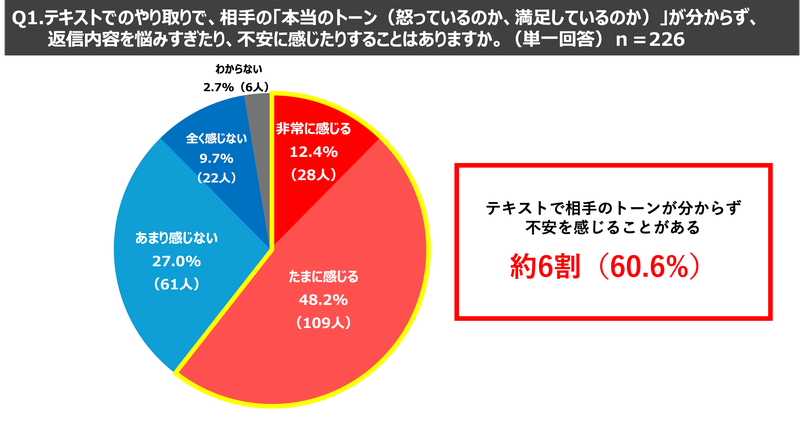 職業で会社員と回答した226名を対象に、テキストコミュニケーションに関する質問をしたところ、テキストコミュニケーションだと相手のトーンが分からず不安を感じると回答した方が、半数以上の約6割(60.6%)にのぼり、相手の顔や声が見聞きできるライブ配信的なコミュニケーションの方がテキストよりも相手の真意を汲み取りやすくスムーズにコミュニケーションが進むという方は、8割以上(83.2%)という結果となりました。コロナ禍やIT技術の進歩により、テキストコミュニケーションが一般的になりつつある一方で、対面やリアルタイムに相手の反応が分かるコミュニケーションが必要だと考えている方が多いということが分かりました。