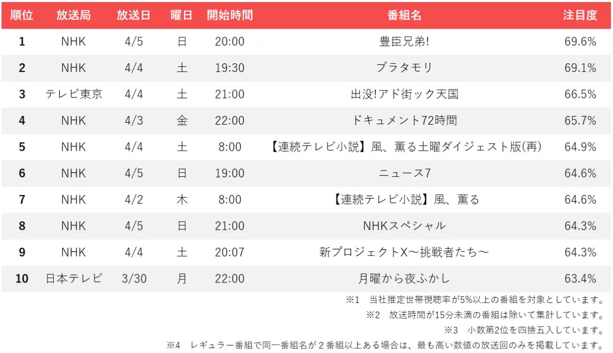 新年度が幕を開けた今週、個人全体のトップ10にNHK番組が8枠を占める結果となった。ドラマからドキュメンタリー、ニュースに至るまで幅広いジャンルで公共放送が上位を独占し、民放勢はテレビ東京「出没!アド街ック天国」が3位、日本テレビ「月曜から夜ふかし」が10位の2番組にとどまっている。