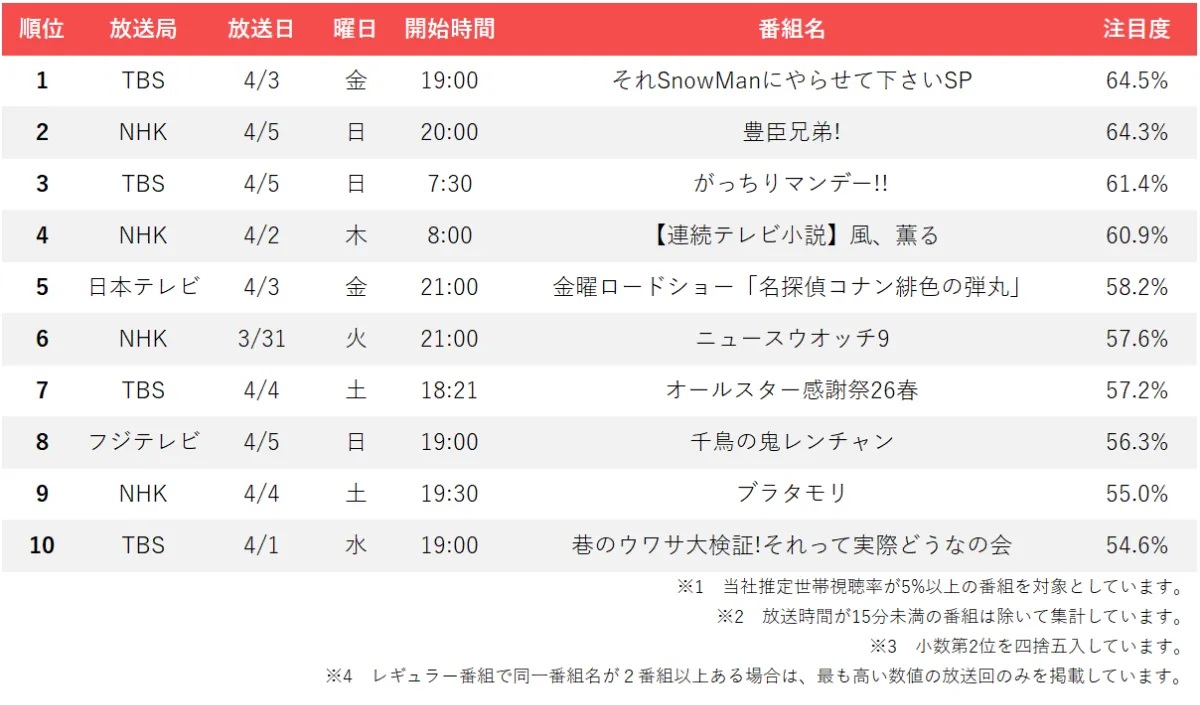 NHKが個人全体トップ10の8枠を独占。BTS登場の『それスノ』がコア首位 週間テレビ番組注目度ランキング【3月30日(月)~4月5日(日)】