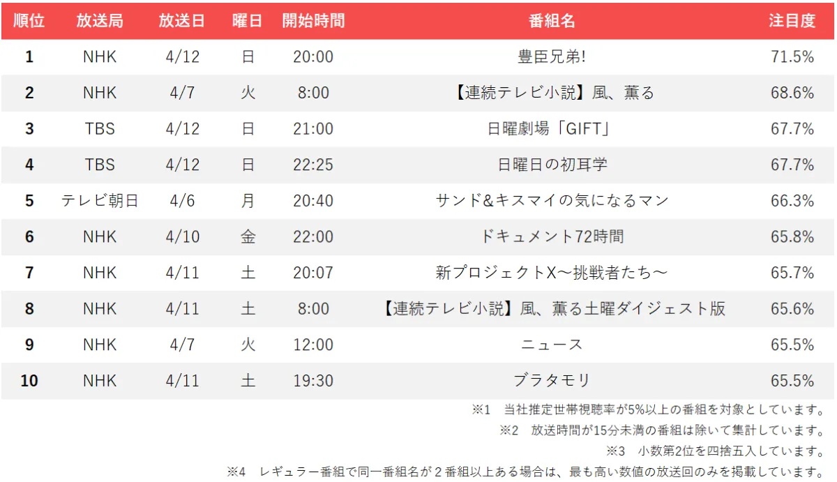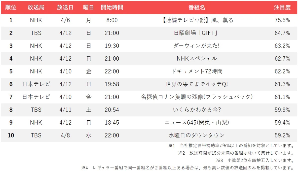 TBS『日曜劇場 GIFT』がコア2位。TBSが民放最多の枠を確保。週間テレビ番組注目度ランキング【4月6日(月)~4月12日(日)】