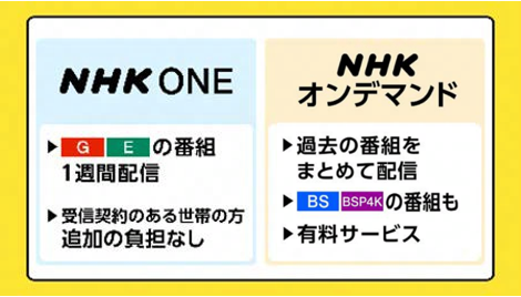 NHKは、改正放送法により「必要的配信」(テレビ・ラジオの同時配信、見逃し・聴き逃し配信、番組関連情報の配信)が必須業務となったことを受け、2025年10月からインターネットサービス「NHK ONE」を開始した。