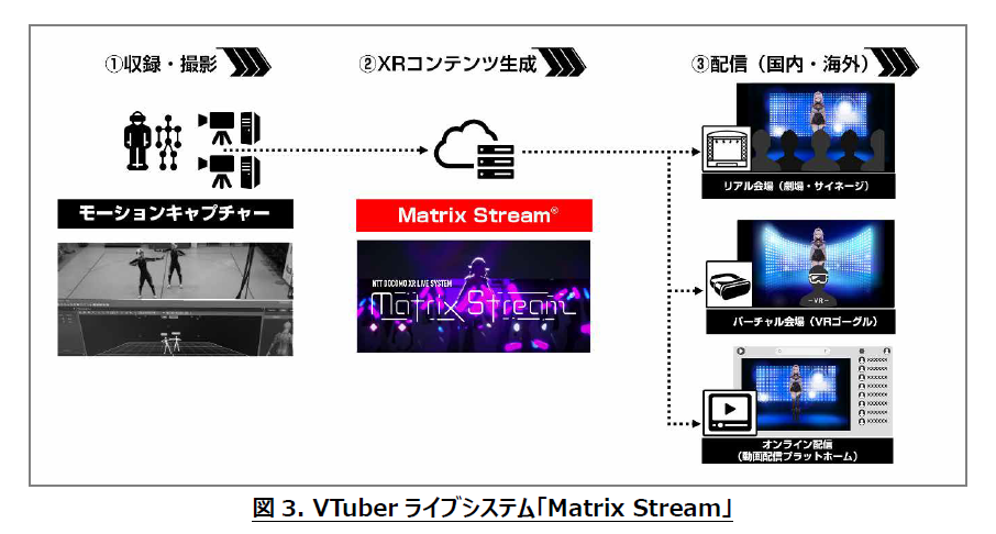 また、スタジオ設備(VTuberライブシステム「Matrix Stream」(図3)※7など)と会場設備(VRゴーグル、カメラなど)の接続については、HDMI信号変換技術※8を搭載したIF変換装置を活用することで、拠点間が離れている状況においても、映像・音声品質の劣化や通信に起因する遅延変動なく、遠隔地への映像・音声伝送が可能であることを実証した。