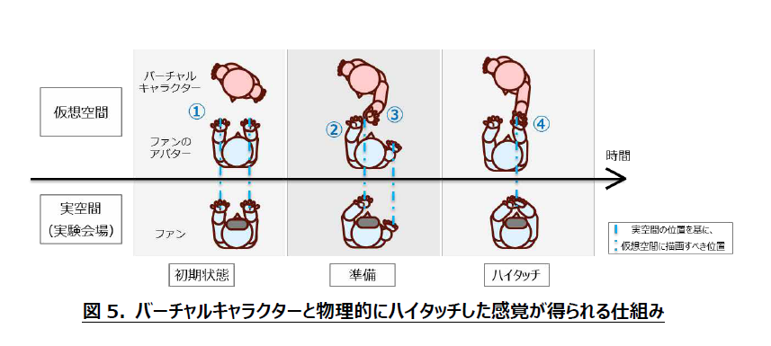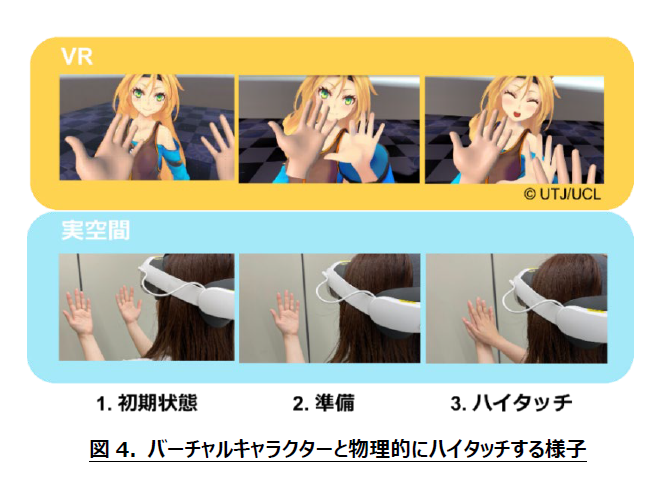 (2) NTTが研究開発したセルフハプティクスによるVR触覚コミュニケーション技術により、VR空間において推しとハイタッチした際の触覚を実感できることを実証