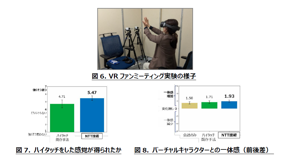 VRファンミーティング実験参加者(計39名)を対象に実施したアンケートの結果、NTTの技術について、「ハイタッチをした感覚」や「バーチャルキャラクターとの一体感」などの項目において高い評価を得ることができた(図6~8)。