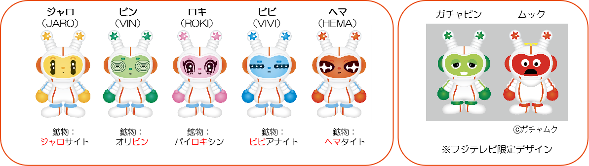 火星の鉱物を由来に誕生した5つの火星キャラクターに加え、フジテレビ限定で火星衣装をまとったガチャピンとムックも登場する。VR火星旅行内でも、これらのキャラクターたちに出会えるチャンスがある。 また、会場限定でオリジナルカプセルトイグッズも発売。火星旅行への搭乗記念として、バラエティ豊かなアイテムを楽しめる。