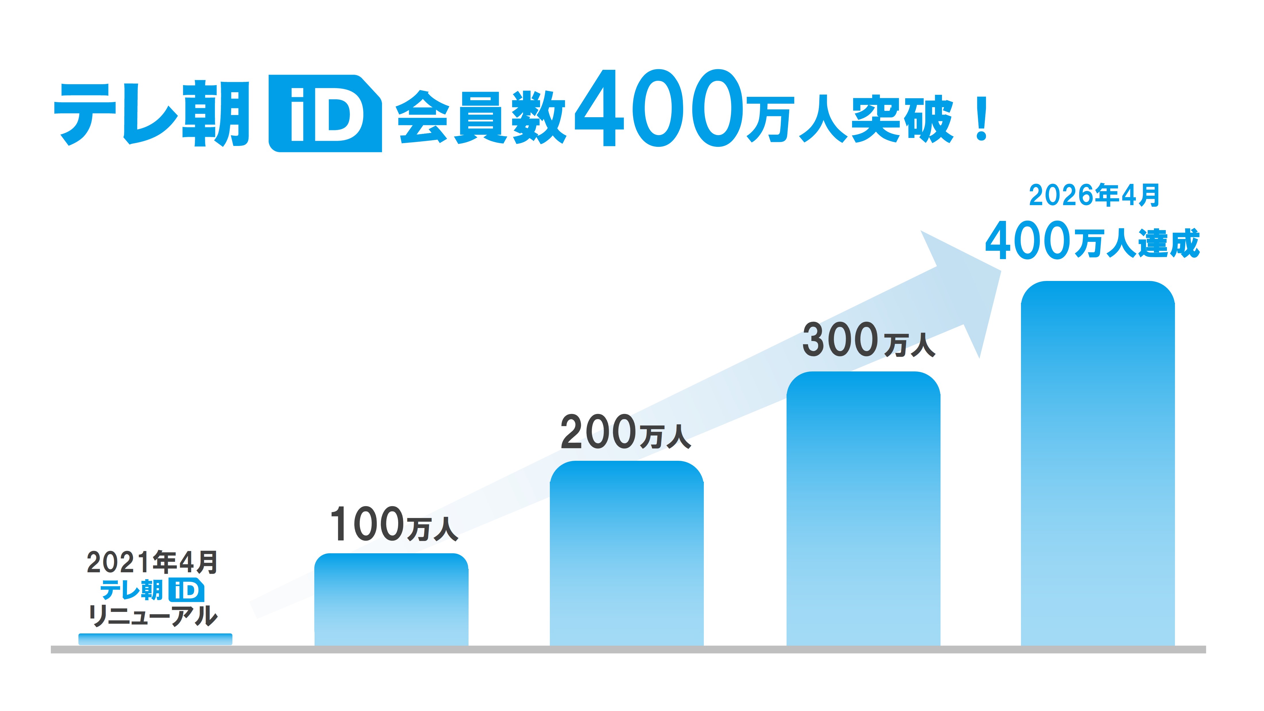 株式会社テレビ朝日は、テレ朝iD会員400万人突破を記念し、抽選で40,000名に総額4,000万円のテレ朝ポイント(期間限定)をプレゼントする「テレ朝iD総額4,000万円大還元祭」を2026年4月28日(火)16時より開催する。