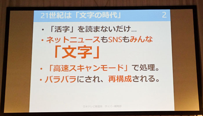 足立義則氏NHKの足立氏のつけたキャッチコピーは「『不安な国」で頼りになるメディア」。東日本大震災を契機にテレビでの情報提供に限界を感じ、必要な情報を必要な人に伝えることを目指して、自社のネット報道アプリを「パーソナルなメディア」と位置付けている。加えて、社内でソーシャルリスニングチーム「SoLT」を運営。情報の需給のミスマッチを防いだり、、情報の精査を行ったりしている。頼りになるメディアとして「ファクトチェックは、何をチェックするのか、正しい情報をどう拡散させるかが難しい」と足立氏は付け加えた。