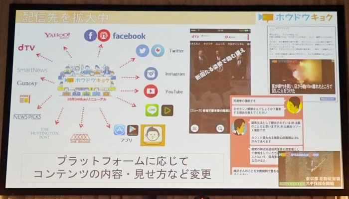 清水俊宏氏フジテレビのニュースサイト「ホウドウキョク」の運営責任者である清水氏がつけたキャッチコピーは「テレビニュースとの自由な付き合い方」。「ホウドウキョク」は2016年10月にリニューアルし、PV数が50倍以上に伸びたが、その要因の一つが「届け方の重視」だ。速報性は重視しつつもライブ番組形式にこだわらず、短尺動画やテキストといったフォーマットから、例えばinstagramであれば若い女の子が好きそうなものにする、Yahoo!であれば少しかためなど、内容や見せ方を変えているなどの工夫を行っている。また清水氏はNewsPicksでの番組配信や、選挙特番でのTwitterとの連携についても言及し「自分のプラットフォームにこだわっていない」とも述べていた。
