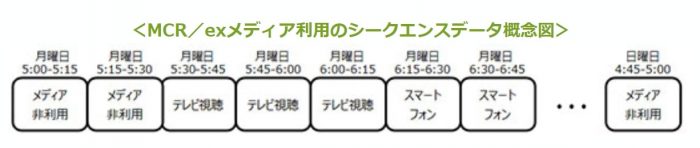 MCR/exの日記形式の生活行動データ(15分単位)を元に、生活者ひとりひとりの日常生活行動やメディア接触行動が時系列に並んだ「シークエンスデータ(=連なったデータ)」を作成することによって、「ソーシャル・シークエンス分析」を実施することができるようになる。