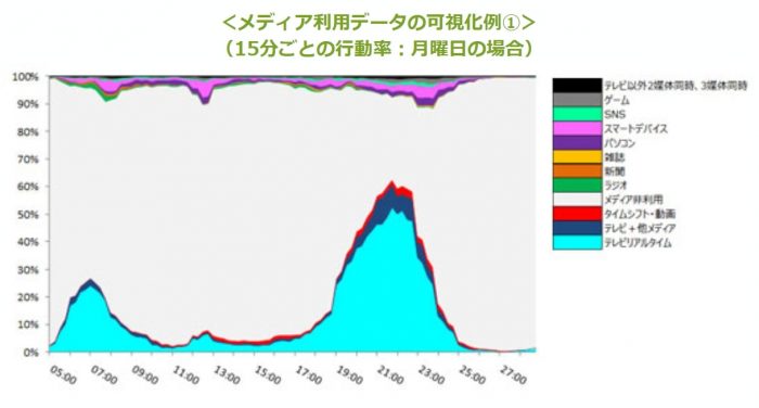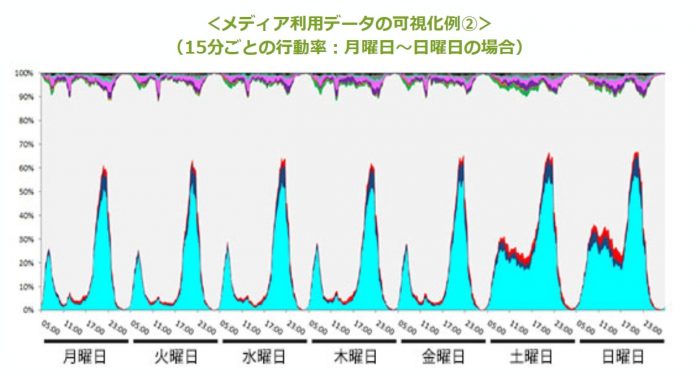 このように、個人ごとの「シークエンスデータ」を作成した後、15分ごとの行動データを集計・グラフ化することで、生活者の行動が可視化。横軸が15分ごとの時間帯、縦軸がその時間帯での各行動についての行動率を表している。これにより、今まで以上に生活者の日常生活行動・メディア接触行動の全体像の把握が容易となる。
