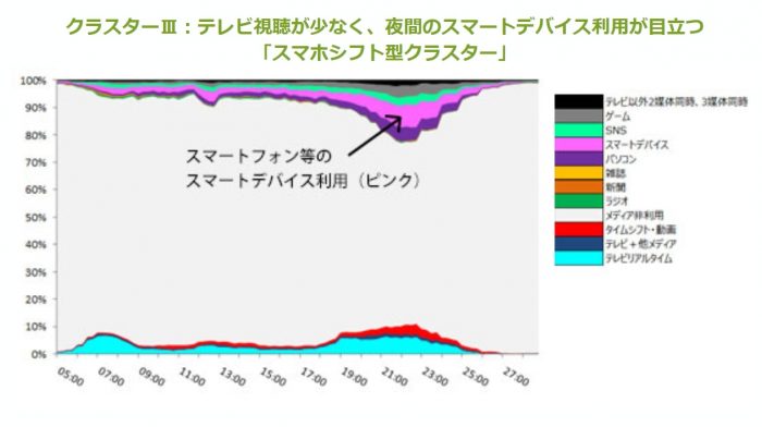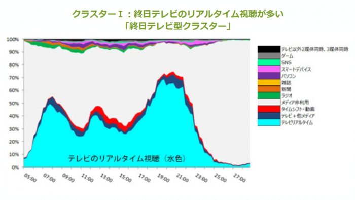 上図からは、朝の7時、夜の22時前後でテレビのリアルタイム視聴(水色)の行動率が高くなることが分かる