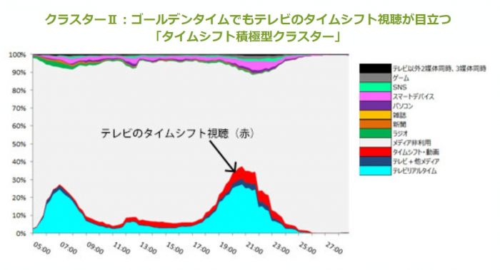 また、上図からは月曜日から金曜日までは似た形になり、規則性が強くあることが分かる。さらに、土曜日、日曜日は日中のテレビのリアルタイム視聴(水色)の割合が平日より高いことが分かる。また、テレビのタイムシフト視聴(赤)の割合も高くなっている。