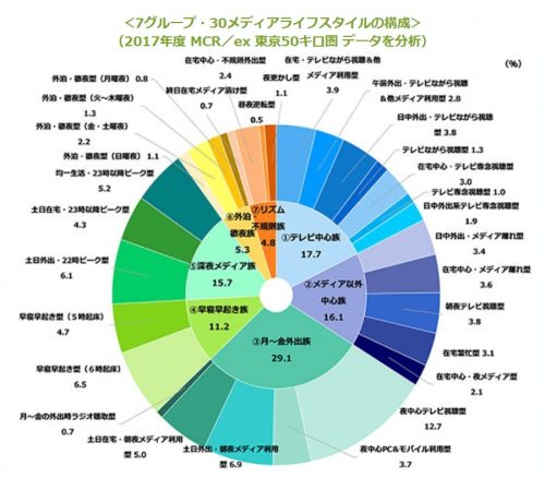 過去に実施されたMCR/exデータ活用したソーシャル・シークエンス分析の取り組みとして、30種に及ぶ「メディアライフスタイル」の分析がある。これは、東京50キロ圏に住む生活者を、自宅内・外での各種メディア・機器接触行動を672時点(7曜日×24時間×15分刻み)で分析し、7グループ・30に及ぶメディアライフスタイル(=メディア接触習慣)に分類したもの。